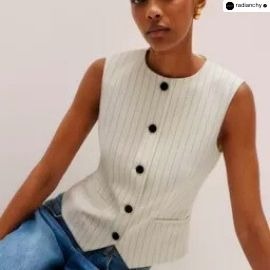 This outfit is all about confidence with a modern twist. The sleeveless buttoned vest brings sharp tailoring into play while keeping it fresh and light — perfect for warmer office days or when you want to skip the blazer but still look put together. The black wide-leg trousers balance the look with structure and elongate the legs, giving that sleek and professional silhouette.