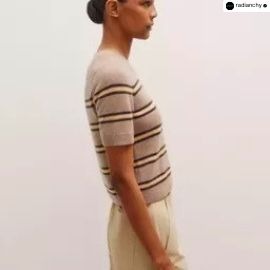 This look is the perfect reminder that comfort and elegance can walk hand in hand. The striped knit top brings a casual, approachable vibe, while the high-waisted wide-leg trousers in a rich brown tone ground the outfit with sophistication. It’s effortless but still very put-together.