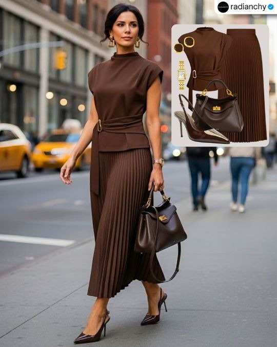 What makes it truly special are the textures and tones. The rich chocolate hue brings warmth and depth, while the gold jewelry adds a glow that elevates the entire palette. Paired with pointed heels and a structured handbag, the look stays sleek, modern, and perfectly polished.