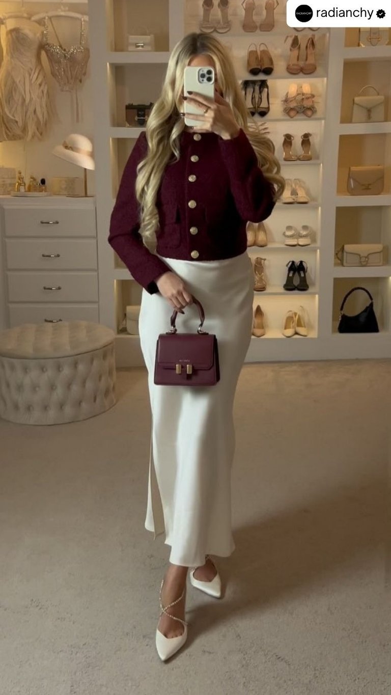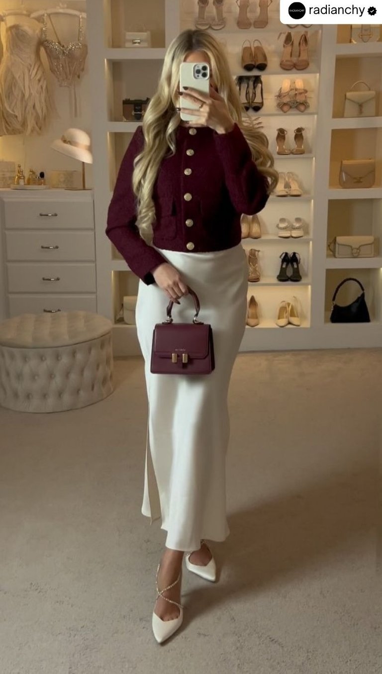 The Old Money elegant burgundy look is perfect for any woman who wants to exude sophistication, grace, and timeless style. With high-quality, elegant pieces like the cropped boucle jacket, silk maxi skirt, and crystal strap heels, you can create a look that is not only refined but also effortlessly chic. By carefully selecting pieces that stand the test of time, you can curate a wardrobe that exudes quiet luxury and never goes out of style.
