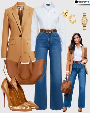 A powerful woman outfit featuring camel and denim styling with wide-leg jeans for an old money inspired look that feels timeless, confident, and effortlessly chic.