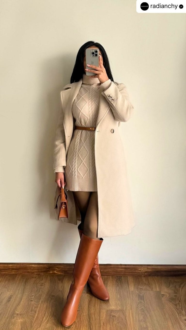 The elegant beige sweater dress paired with a stylish beige overcoat creates the perfect balance of chic and cozy for the colder months. This outfit is ideal for casual outings, brunch with friends, or even a day at the office. The soft color palette of beige, complemented by caramel accessories like a belt and bag, adds a sophisticated touch. The high knee boots not only provide comfort but also elevate the look with a confident and modern vibe. This ensemble is a prime example of how to stay warm without sacrificing style.