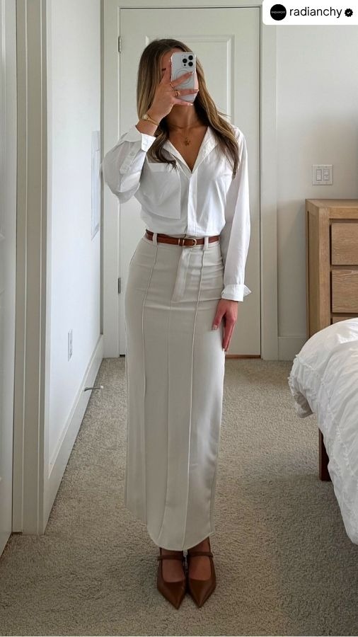 A long, ankle-grazing skirt instantly communicates elegance and quiet power. It’s modest, yes, but never boring — especially when styled with clean lines and quality fabrics like satin, crepe, or structured cotton.