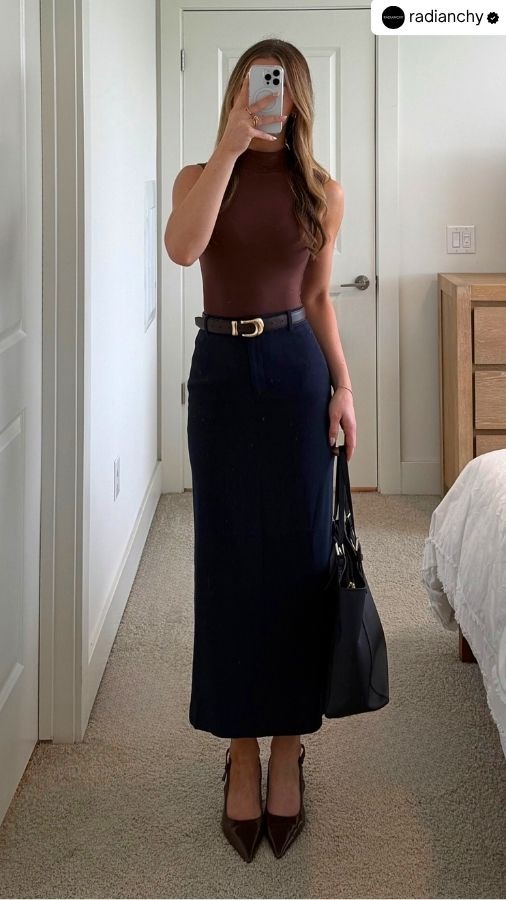If you want to balance elegance and modernity, the midi skirt is your go-to. Sitting mid-calf, it’s the perfect length to show off great shoes, move freely through your day, and transition from desk to dinner with no effort.
