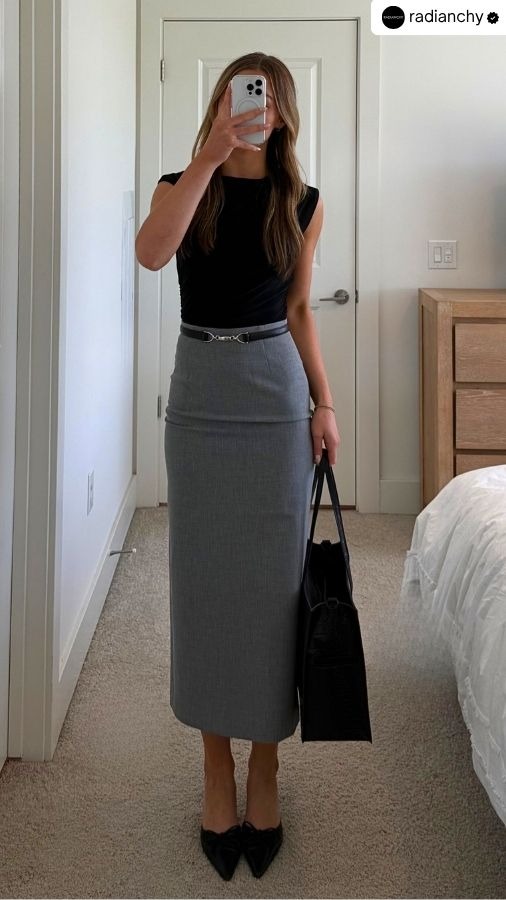 Let’s break down the formula of a powerful work skirt outfit — piece by piece.