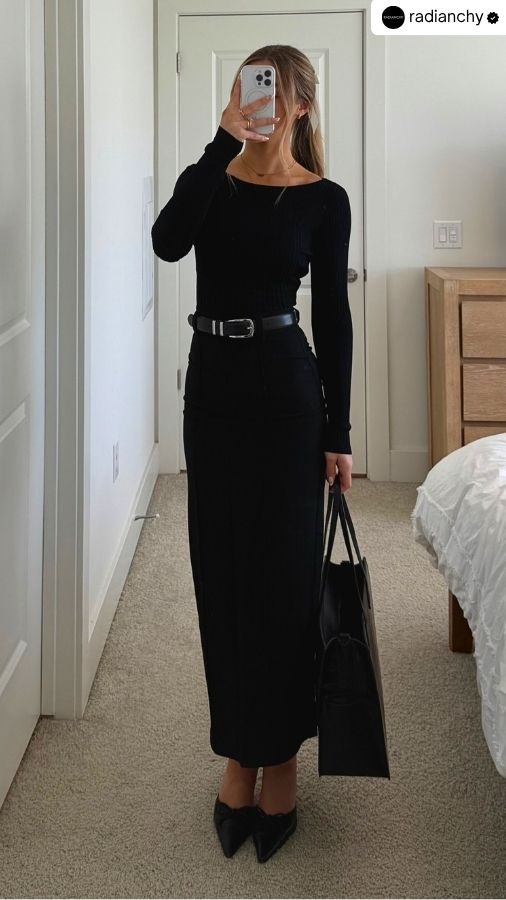 Long skirts work beautifully in minimalist color palettes — think slate gray, soft taupe, jet black, or creamy off-white. They elongate the body, especially when paired with a fitted top or tucked-in blouse and a waist-defining belt. A long skirt says: “I’m refined, I’m intentional, and I don’t need loud trends to stand out.” This is the kind of outfit you wear when you want to be remembered for your presence.